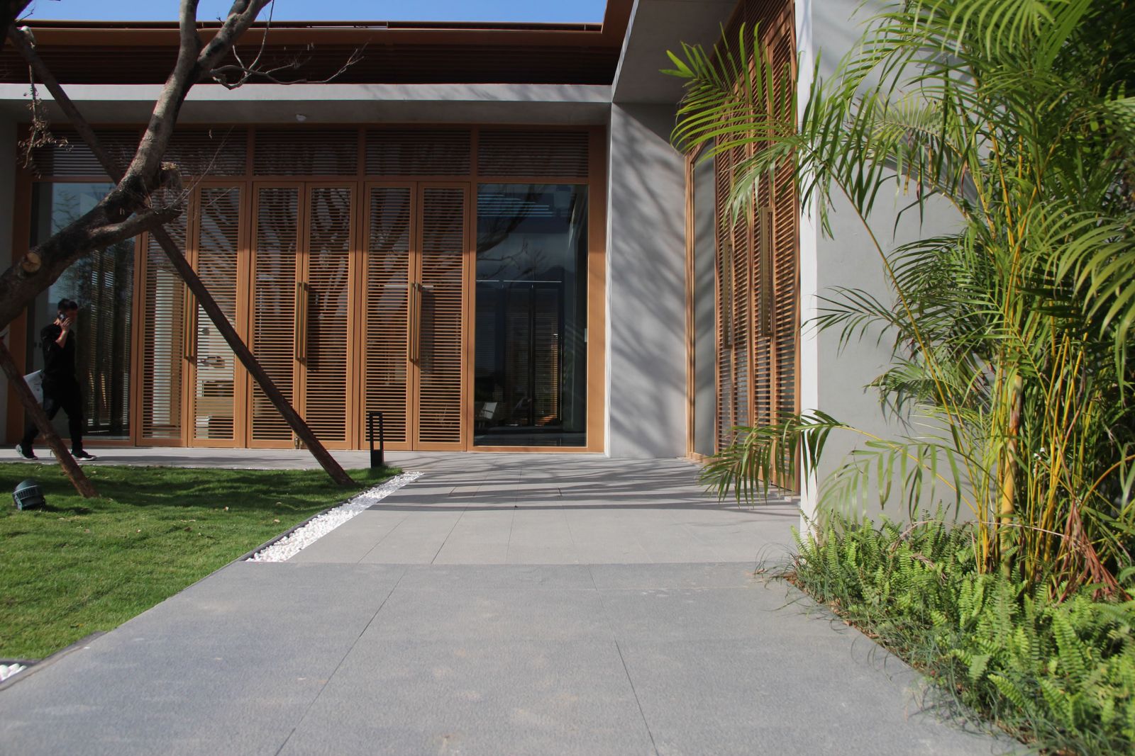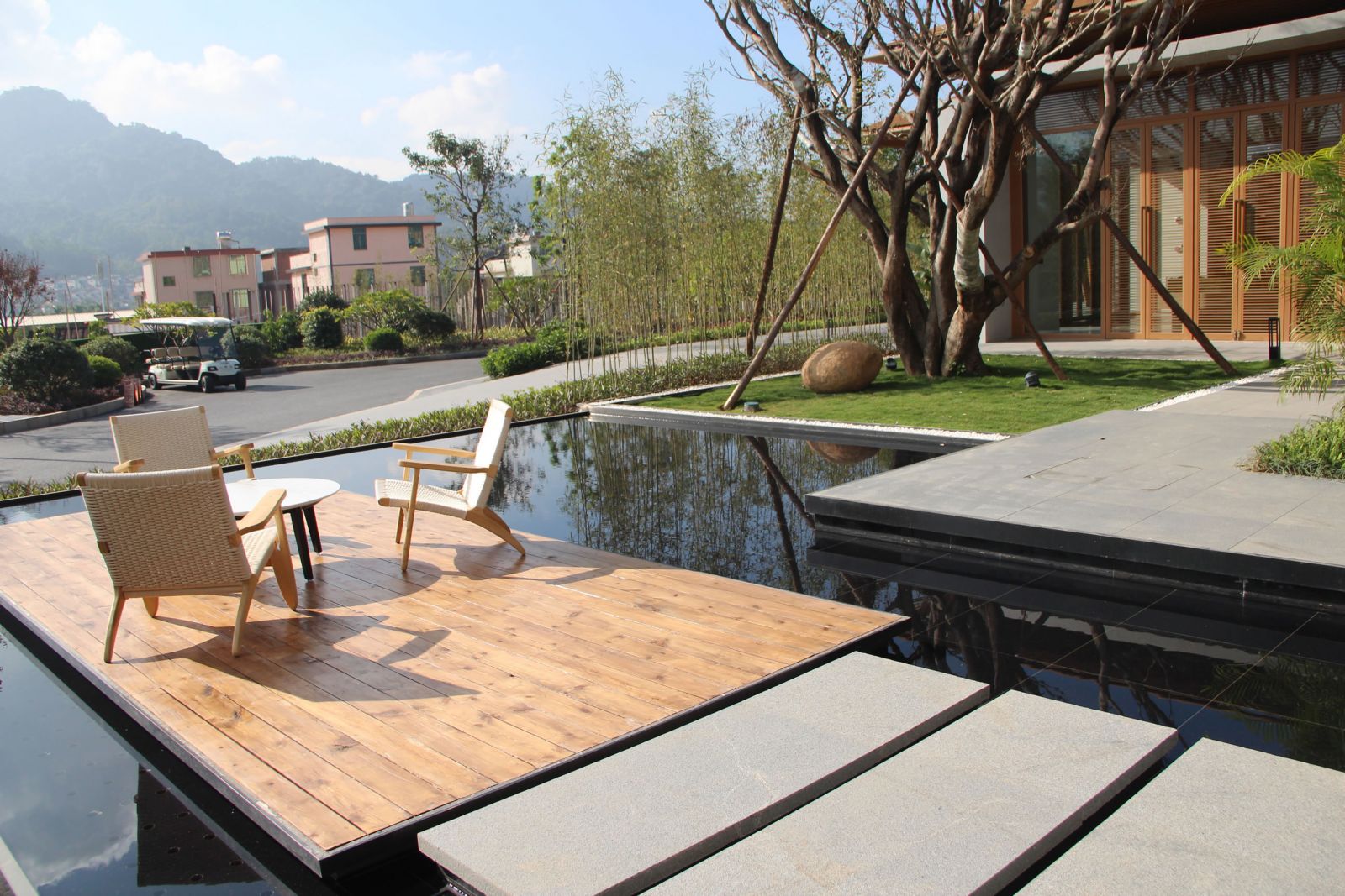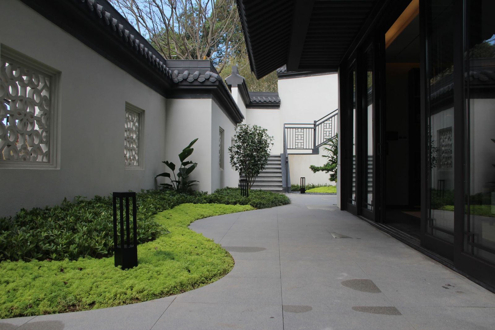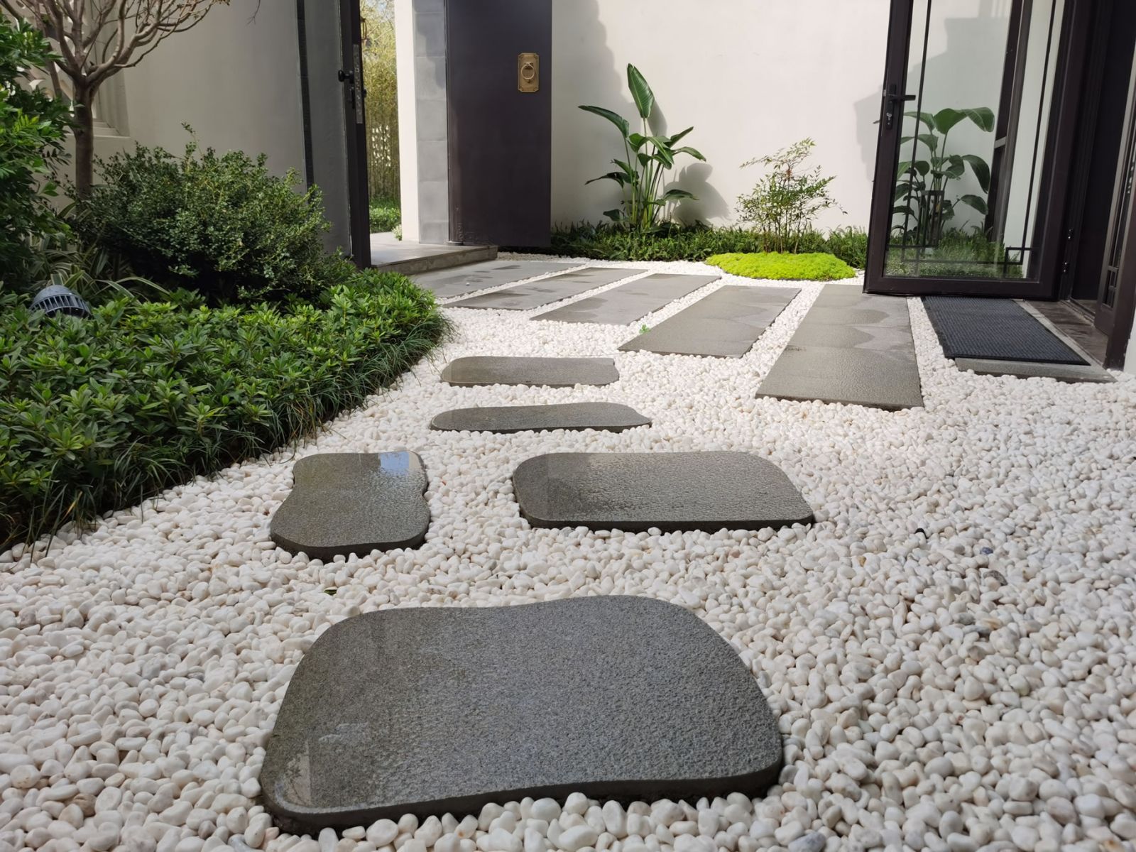 區(qū)域內廣場、水景、汀步及別墅庭院采用協進地鋪石瓷磚裝飾,