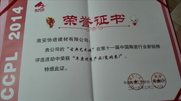 熱烈祝賀協(xié)進(jìn)陶瓷古典藝術(shù)磚在號(hào)稱“中國陶瓷行業(yè)奧斯卡”評(píng)選活動(dòng)中榮獲年度優(yōu)秀產(chǎn)品獎(jiǎng)。