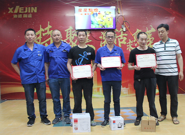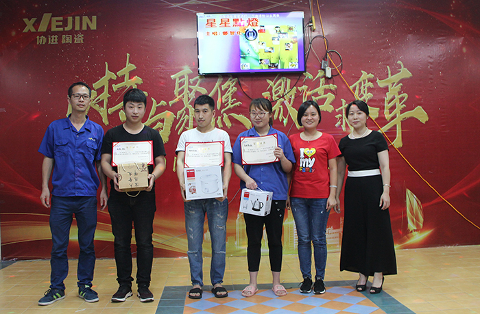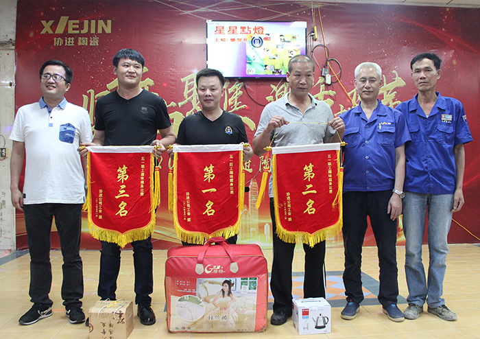 晚會(huì)首先由馮先祿副總經(jīng)理宣讀《關(guān)于表彰慶祝2018年五一國(guó)際勞動(dòng)節(jié)活動(dòng)比賽優(yōu)勝者(團(tuán)隊(duì))的決定》。制造三課陳廷相、制造六課何金槍、制造五課王昌明等施釉技能比賽優(yōu)勝者;技術(shù)部楊永祥、吳林艷、張俊等對(duì)樣技能比賽優(yōu)勝者,以及制造三課代表隊(duì)、制造一部和品保部代表隊(duì)、倉(cāng)儲(chǔ)課和行政后勤代表隊(duì)等4支趣味健身比賽優(yōu)勝團(tuán)隊(duì)代表上臺(tái)接受公司領(lǐng)導(dǎo)的表彰。