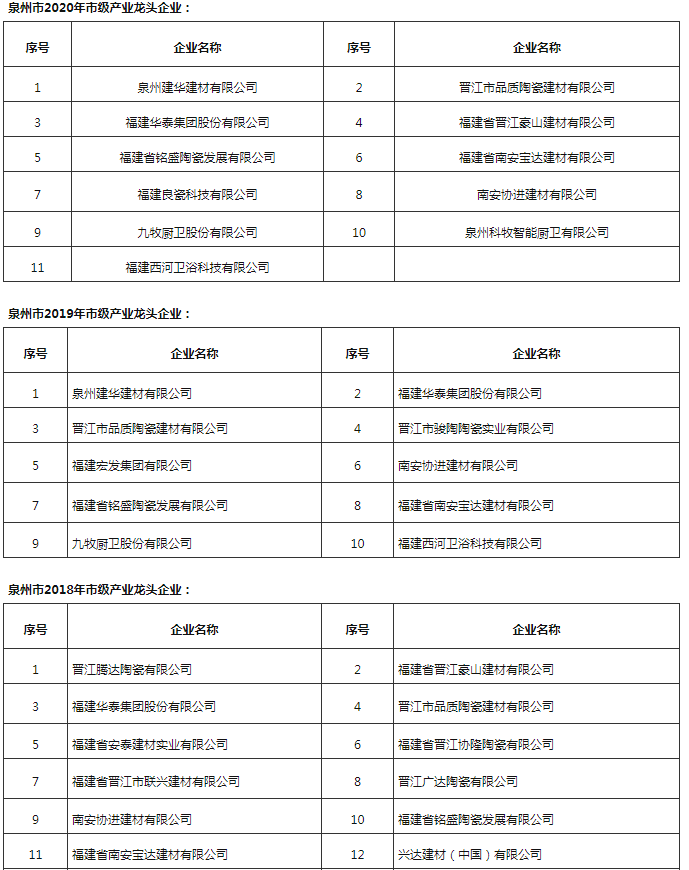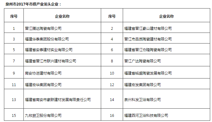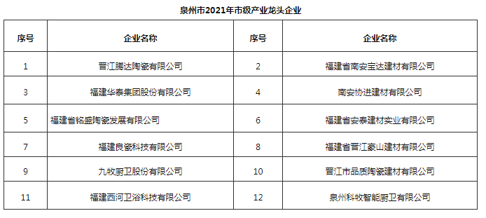 其中,建材家居行業(yè)中,協(xié)進(jìn)、九牧等12家福建陶衛(wèi)企業(yè)進(jìn)入2021年泉市級產(chǎn)業(yè)龍頭企業(yè)項(xiàng)目名單。