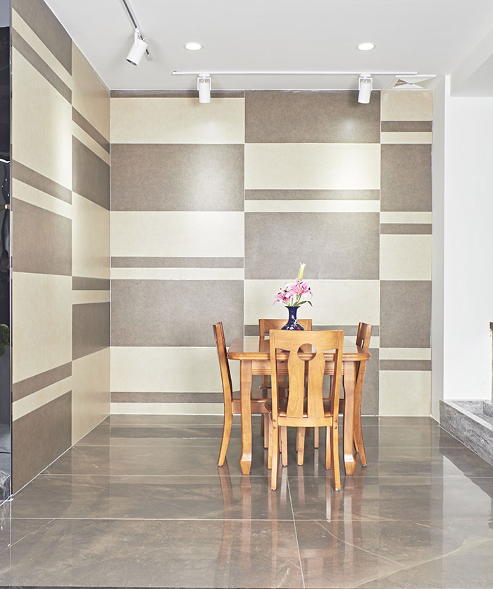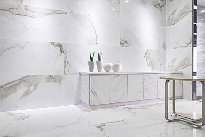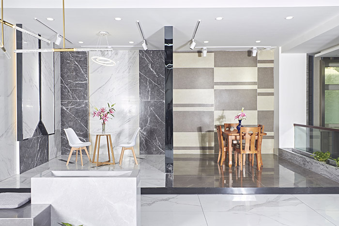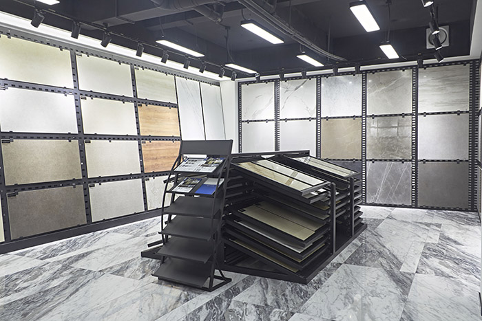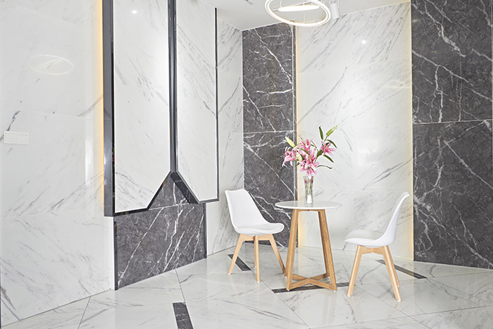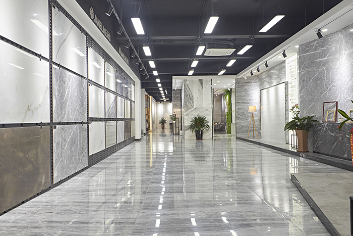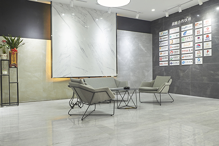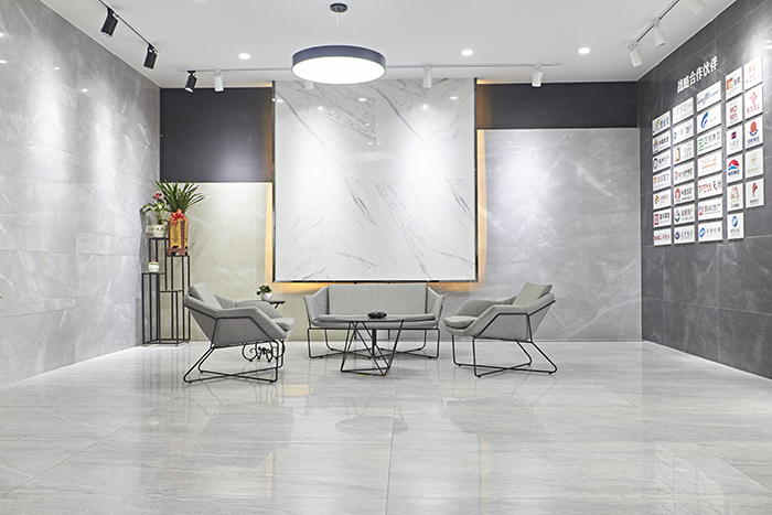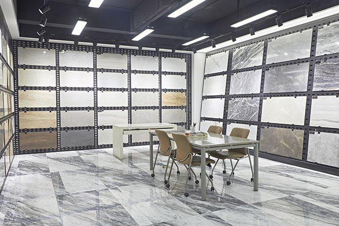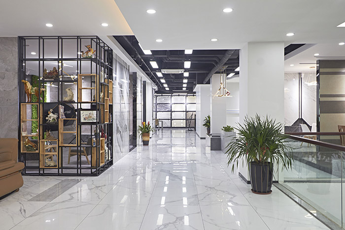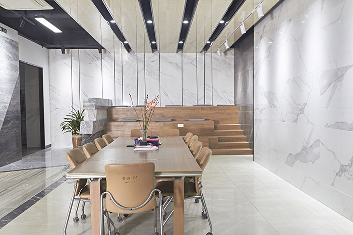 展廳使用 750*1500MM最新規(guī)格簡約大理石產(chǎn)品 與600*1200MM薄型陶瓷板鋪貼裝飾 整體效果簡約現(xiàn)代不拘一格